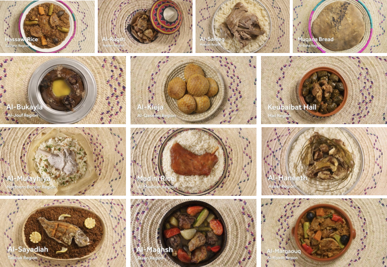 மதீனி அரிசி மதீனா பகுதிக்கான உணவாகும், அல்-முலைஹியா வடக்கு எல்லைப் பகுதிக்கான உணவாகவும், அல்-ஜூஃப் பகுதிக்கான பிராந்திய உணவாக அல்-புகைலாவும், அல்-பஹா பிராந்தியத்திற்கான முகானா ரொட்டியும், ஹைல் பகுதிக்கான கியூபைபத் ஹைலும், கோதுமையில் இருந்து தயாரிக்கப்படும் பிரபலமான உணவான நஜ்ரான் பகுதிக்கான அல்-ருக்ஷும் தேர்ந்தெடுக்கப்பட்டன.