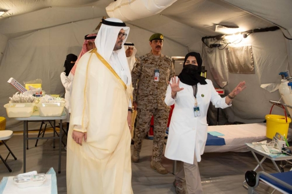 கிழக்கு அராபத் மருத்துவமனைக்குச் சென்று, 405 படுக்கைகள் கொண்ட அவசரநிலை, தனிமைப்படுத்தல் மற்றும் தீவிர சிகிச்சை பிரிவுகள் உட்பட பல்வேறு துறைகளிலும், கிடானா டெவலப்மென்ட் நிறுவனத்தால் மேற்பார்வையிடப்படும் ஆப்பிரிக்க அல்லாத அரபு பயணிகளுக்கான இரண்டு அடுக்கு வசதியான அரபாத் முகாம்கள் மேம்பாட்டுத் திட்டத்தைத் துணை அமீர் ஆய்வு செய்தார்.