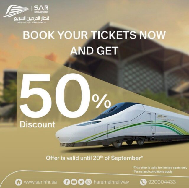 ஹரமைன் அதிவேக இரயில்வேயில் டிக்கெட்டுகளை முன்பதிவு செய்தால் 50% தள்ளுபடி. இச்சலுகை செப்டம்பர் 20 வரை செல்லுபடியாகும். இந்தச் சலுகை வரையறுக்கப்பட்ட இருக்கைகளுக்கு மட்டுமே செல்லுபடியாகும். இது விதிமுறைகள் மற்றும் நிபந்தனைகளுக்கு உட்பட்டது என்பது குறிப்பிடத்தக்கது.